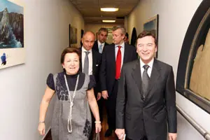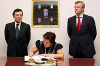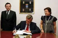 Pilar Farjas firmando en el Libro de Honor del Centro Galicia.