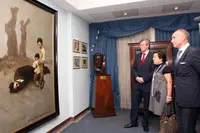 Los conselleiros y el secretario xeral observa uno de los cuadros de Castelao expuestos en la sede del Centro Galicia de Buenos Aires.
