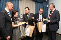 Intercambio de regalos con el presidente y secretario del Centro Galicia.