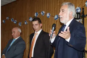 Miguel Santalices saluda a los asistentes, acompañado por José Luis Cambón y Ramiro Vieito.