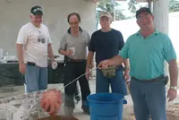 Adolfo Rodríguez y José Ramón de los Ríos observan a Ángel Miguel Quiroga, quien cocinó el pulpo.