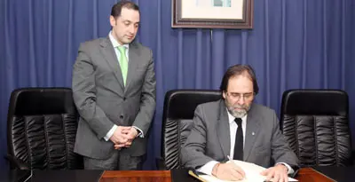 Coscia firma en el libro de honor de Cospeito, acompañado por el alcalde.
