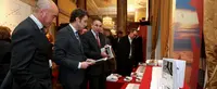 Feijóo, acompañado por Santiago Camba y Miguel Seco, observa los folletos sobre el Xacobeo en el Centro Gallego.