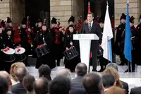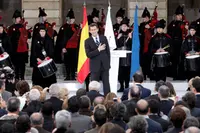 Alberto Núñez Feijóo realiza su discurso como presidente en la Plaza del Obradoiro.