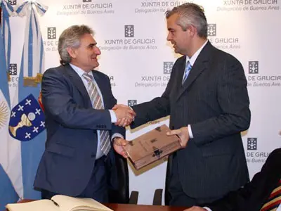El director xeral de Promoción y Difusión Cultural de la Xunta de Galicia entrega un presente al delegado del gobierno gallego en Argentina.