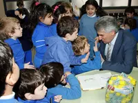 Francisco López conversa con los niños del nivel inicial del Colegio Santiago Apóstol, durante su visita a esta institución educativa.