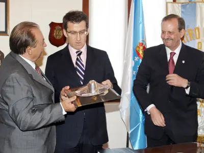 El presidente Núñez Feijóo recibe un presente del presidente del Centro Gallego, Luis Piñeiro.