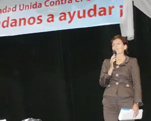 María José Rubio Vidal se dirige al público presente durante el inicio del ‘Gran Bingo’ en beneficio de la Sociedad Anticancerosa de Venezuela.
