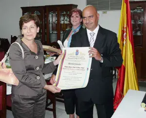 Rubio Vidal recibe un pergamino de manos del presidente de la HGV, Luis Couto, asistido por la secretaria de Relaciones Públicas, Noemí Cendón de Ferreira.