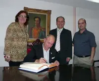 El secretario xeral de Emigración firma en el libro de honor de la institución.