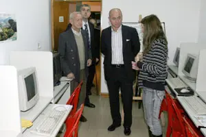 Alenjandra Marcote muestra a Camba la escuela de computación del Centro Gallego de Jubilados y Pensionistas de Avellaneda.