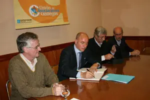 Camba firma el libro de visitantes de la Unión. Lo rodean directivos de la casa.