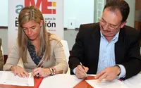 Victoria Cristóbal y Javier Grande firmaron el convenio de colaboración entre la AME y la peña 'Los Gatos'.