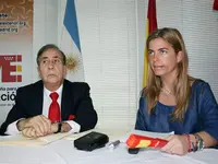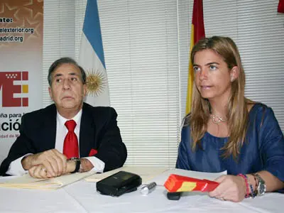Victoria Cristóbal durante la rueda de prensa que ofreció en la sede del Centro Riojano en Buenos Aires. A su lado, Francisco Puebla.