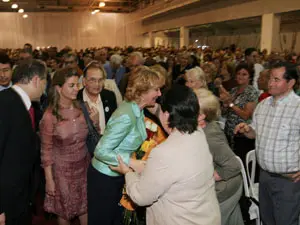La presidenta Esperanza Aguirre, acompañada por Victoria Cristóbal, recibe los saludos de algunas paisanas en el recinto ferial Costa Salguero de Buenos Aires, a donde acudieron unas dos mil personas, en el mes de marzo.