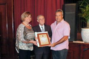Ana María de Méndez y Javier Medina, vicepresidenta y presidente de la asociación, entregan la Placa de Honor a Antonio Álamo –centro–.