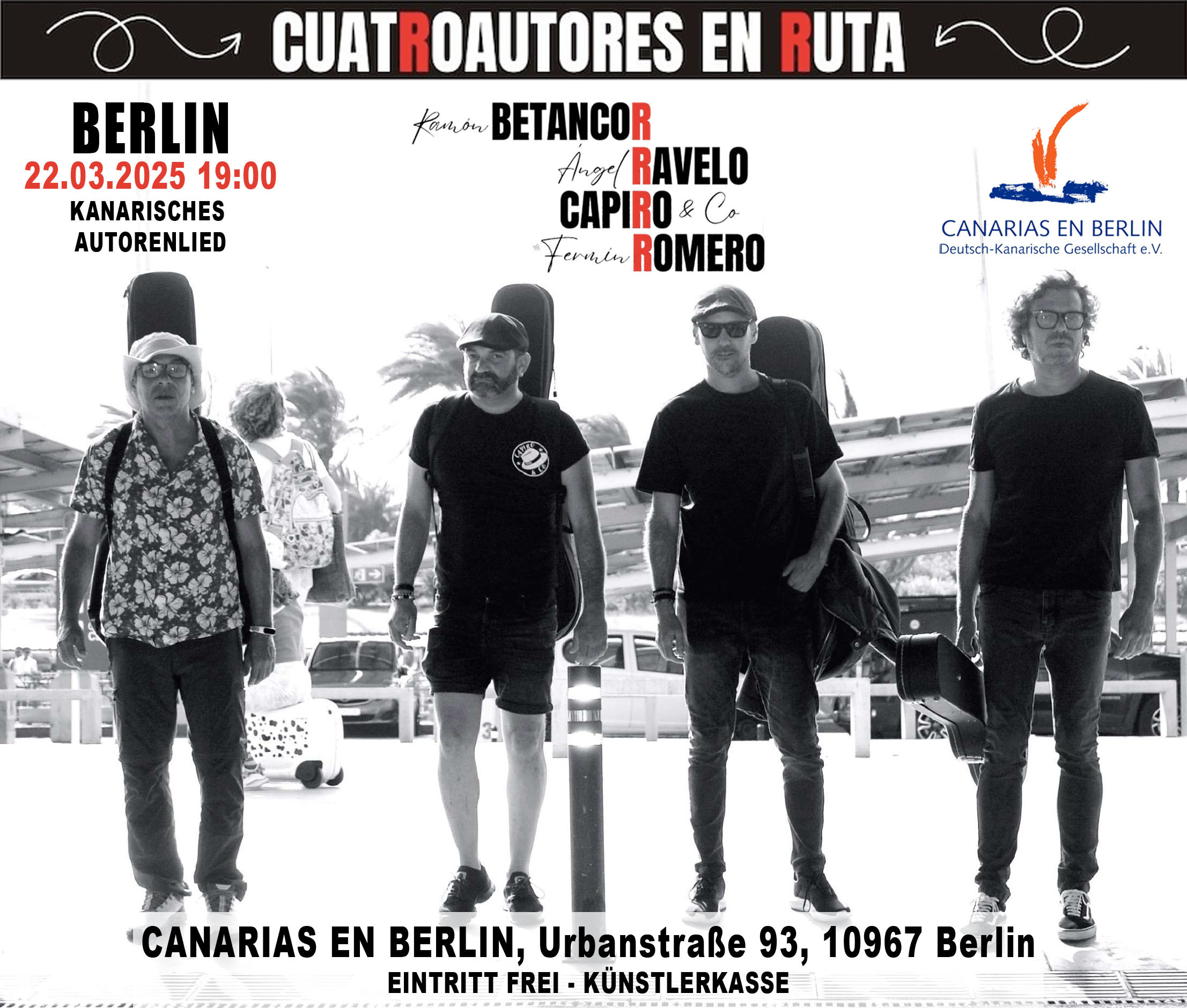 La gira ‘Cuatroautores en Ruta’ llega el próximo 22 de marzo a Berlín. Será en la Asociación Canarias de la capital alemana a partir de las 19:00 horas, cuando el público pueda escuchar el concierto compartido entre los cantautores canarios Ramón Betancor, Ángel Ravelo, Fermín Romero y Capiro & Co.
