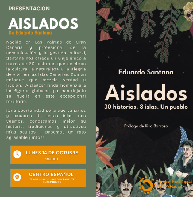 El Centro Español de Luxemburgo será el escenario, el lunes 14 de octubre, a las 19:00 horas, de una fascinante presentación: el escritor y comunicador canario Eduardo Santana compartirá su más reciente obra ‘Aislados’. Se trata de un libro que recoge 30 historias que celebran la riqueza cultural, la naturaleza y la vida en las Islas Canarias.
