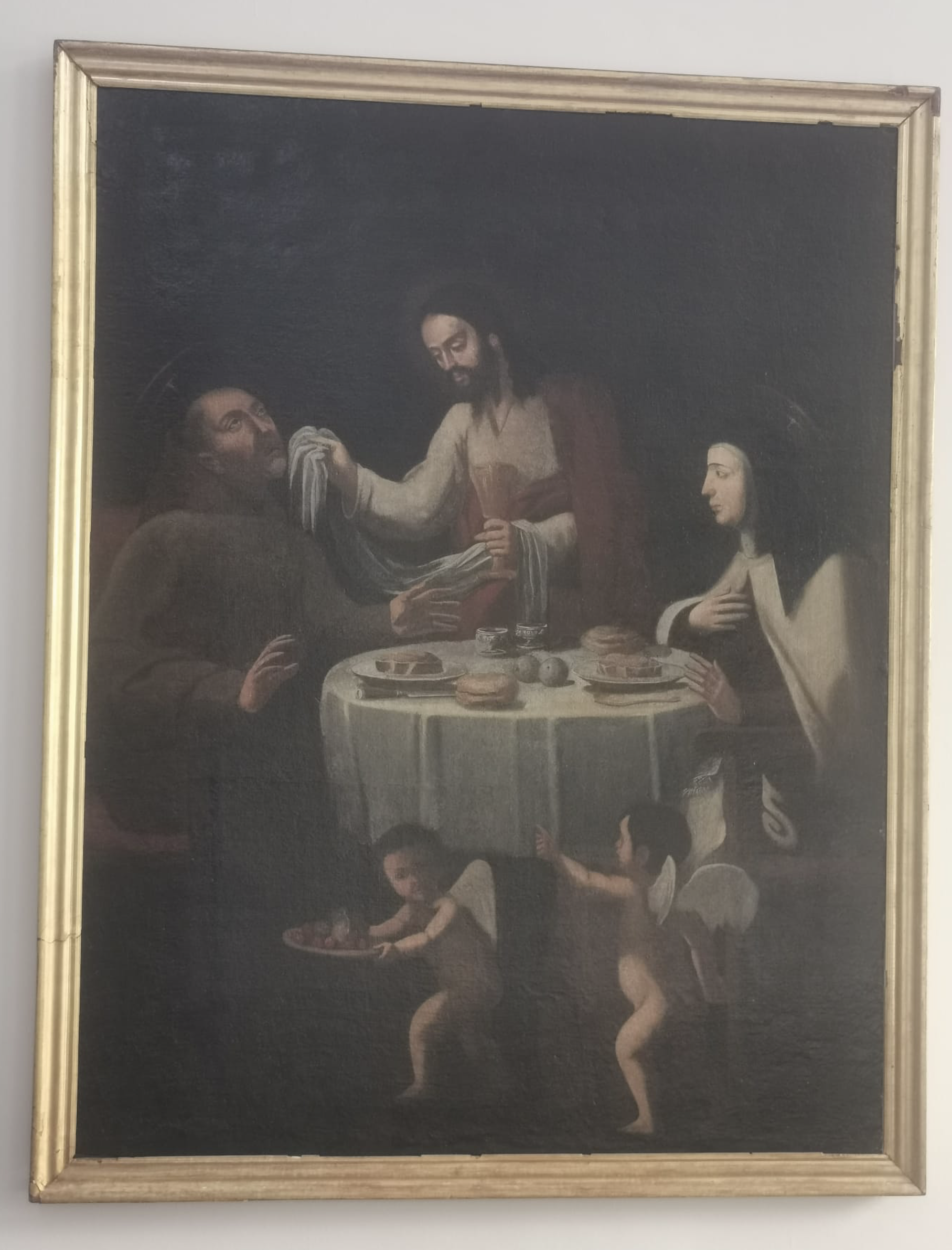 Esta obra, cuyo autor es anónimo, lleva por título ‘Cristo da de beber a San Pedro de Alcántara en presencia de Santa Teresa de Jesús’. De pleno siglo XVII, forma parte del ciclo temático ‘Cristo invita, da de comer y da de beber a San Pedro de Alcántara en el convento de la Encarnación, en presencia de Santa Teresa de Jesús’, revelando la temática de la propia obra.