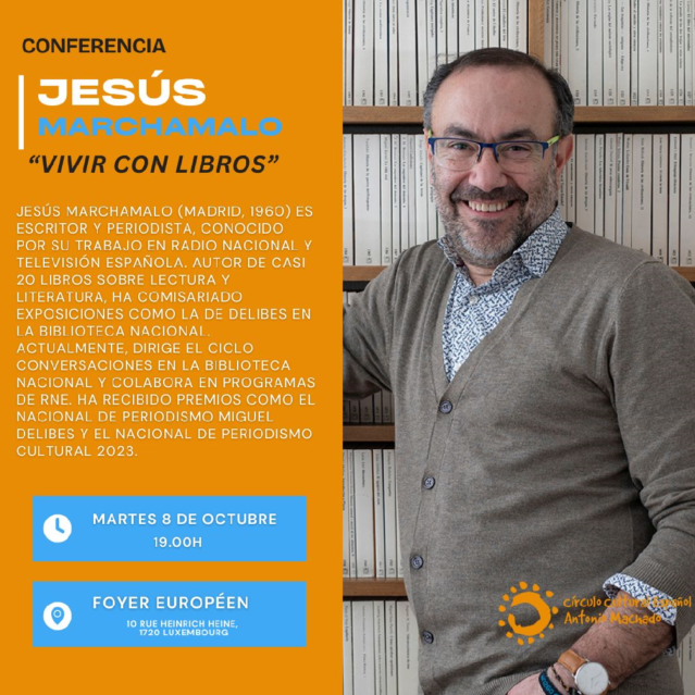 El escritor y periodista Jesús Marchamalo ofrecerá, el próximo martes 8 de octubre, a las 19:00 horas, la conferencia ‘Vivir con libros’ en el Foyer Européen de Luxemburgo, en una actividad organizada por el Círculo Cultural Español Antonio Machado.