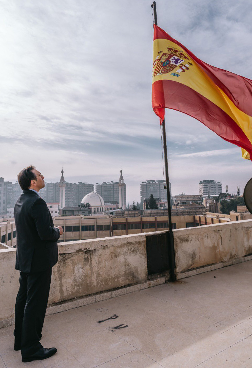 Tras más de 12 años, el ministro de Asuntos Exteriores, Unión Europea y Cooperación, José Manuel Albares, presidió el izado de la bandera de España en la sede de la Embajada de España en Damasco, en Siria, tras más de 12 años desde su retirada.