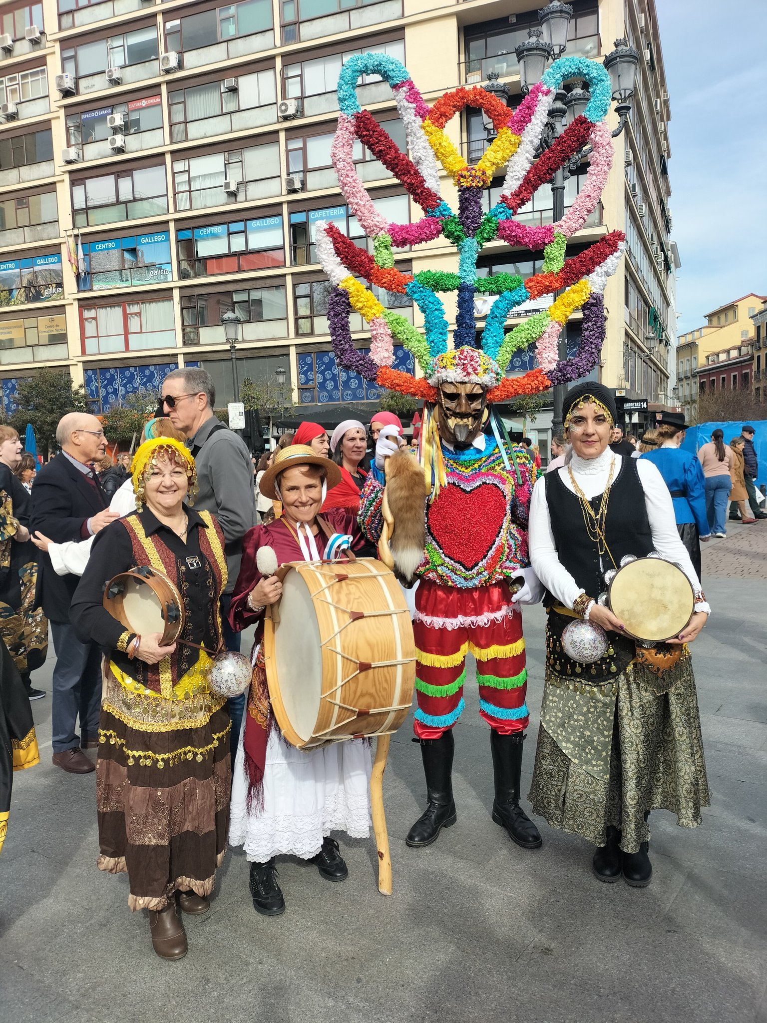 Además de la charla, los miembros de la Agrupación Artística Galega Rosalía de Castro desfilaron por la calle e hicieron partícipes de la tradición del ‘entroido’ a los vecinos donde está ubicada la sede del Centro Gallego.