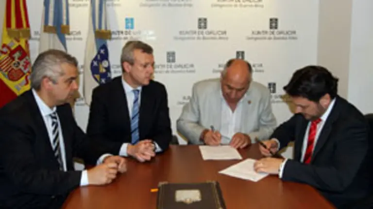 El vicepresidente del Gobierno gallego y conselleiro de Presidencia, Administracións Públicas e Xustiza, Alfonso Rueda, y el secretario xeral de Emigración, Antonio...